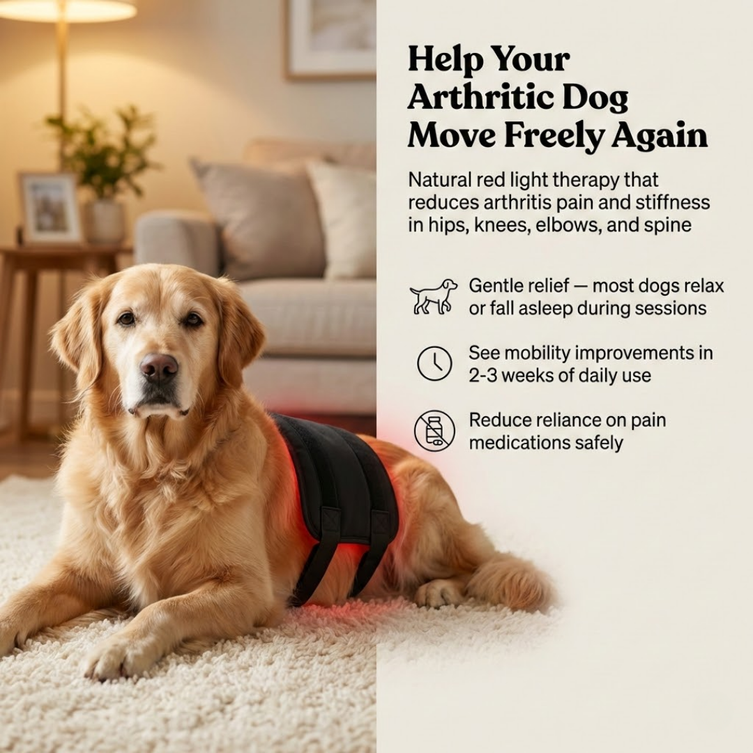 Red light therapy penetrates deep into arthritic joints, reducing inflammation and stiffness so your dog can walk, climb stairs, and play without struggling.