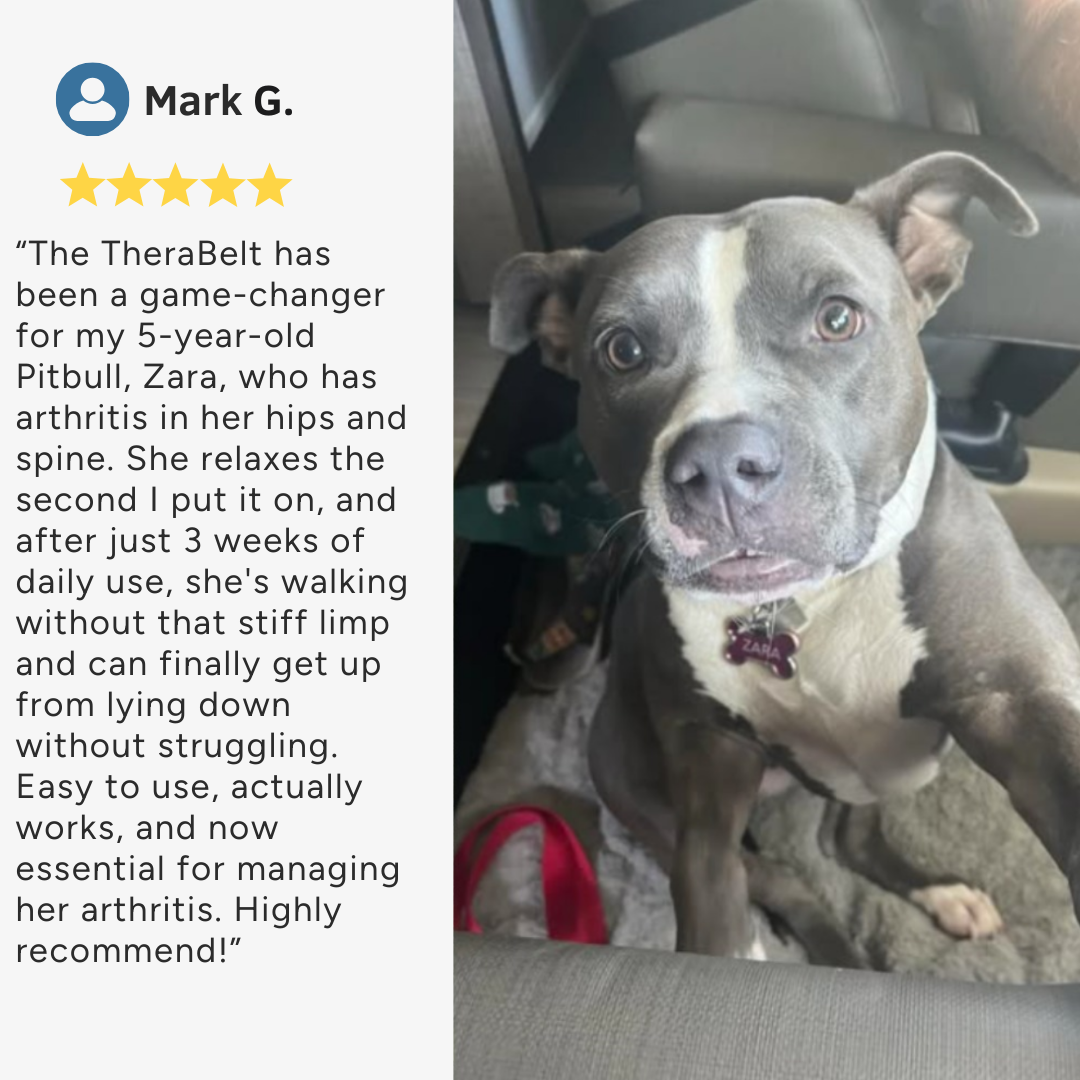 Arthritis stole my dog's ability to do simple things like walking to his food bowl. After 6 weeks with TheraBelt, he's moving freely, and I saw him RUN for the first time in a year. It's given us both hope again. Highly recommend!