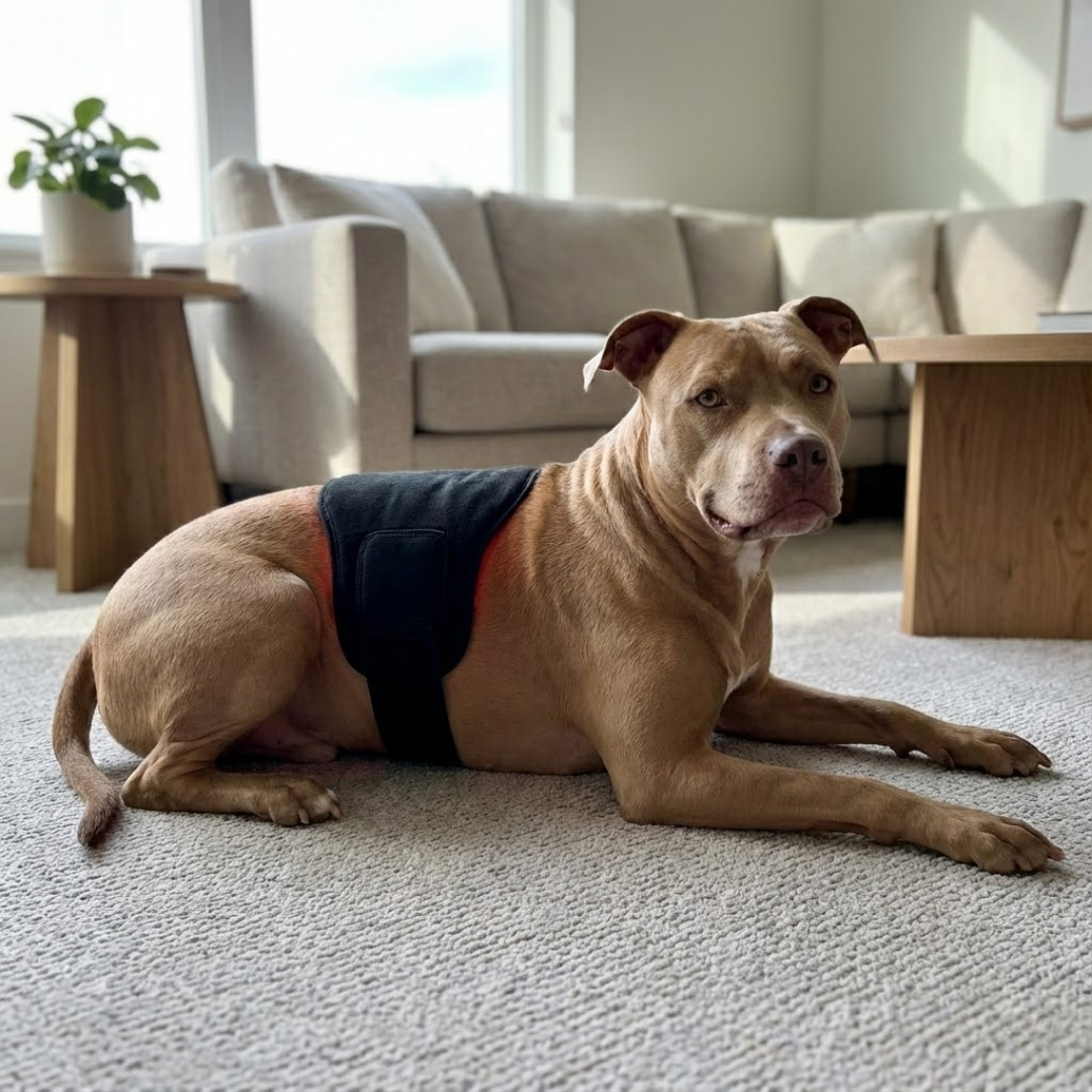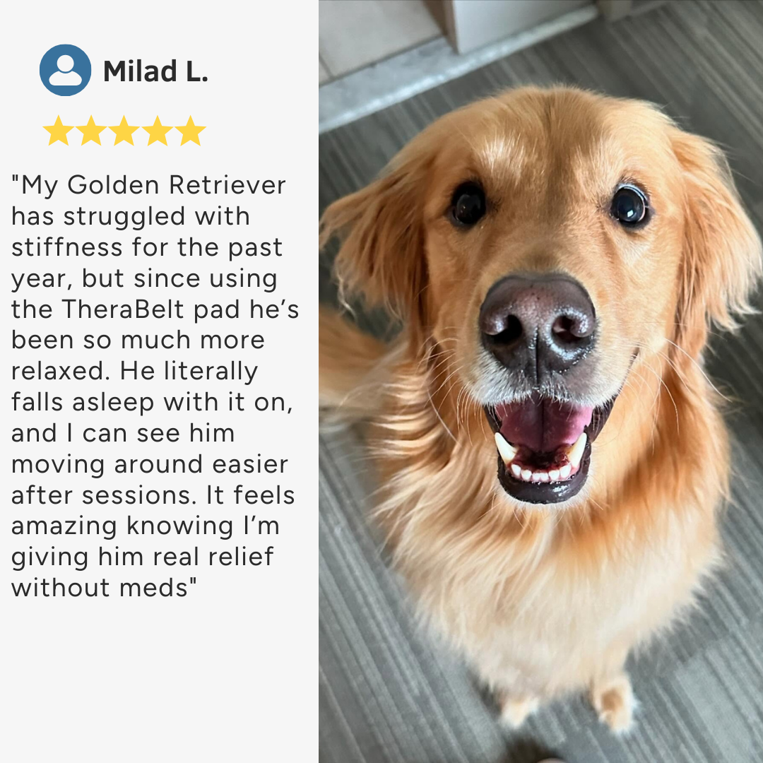 My Golden Retriever has struggled with stiffness for the past year, but since using the TheraBelt he’s been so much more relaxed. He literally falls asleep with it on, just like in this picture, and I can see him moving around easier after sessions. It feels amazing knowing I’m giving him real relief without meds.