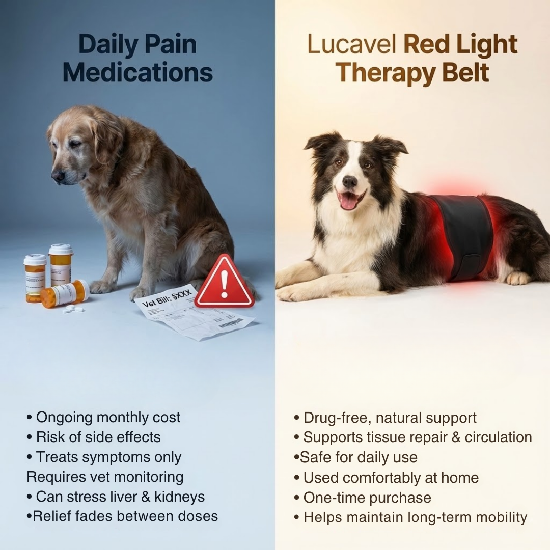 When your dog starts slowing down, the usual path can get expensive fast — medications, rehab visits, or surgery. Lucavel gives you at-home red light therapy in a one-time belt you can use daily.